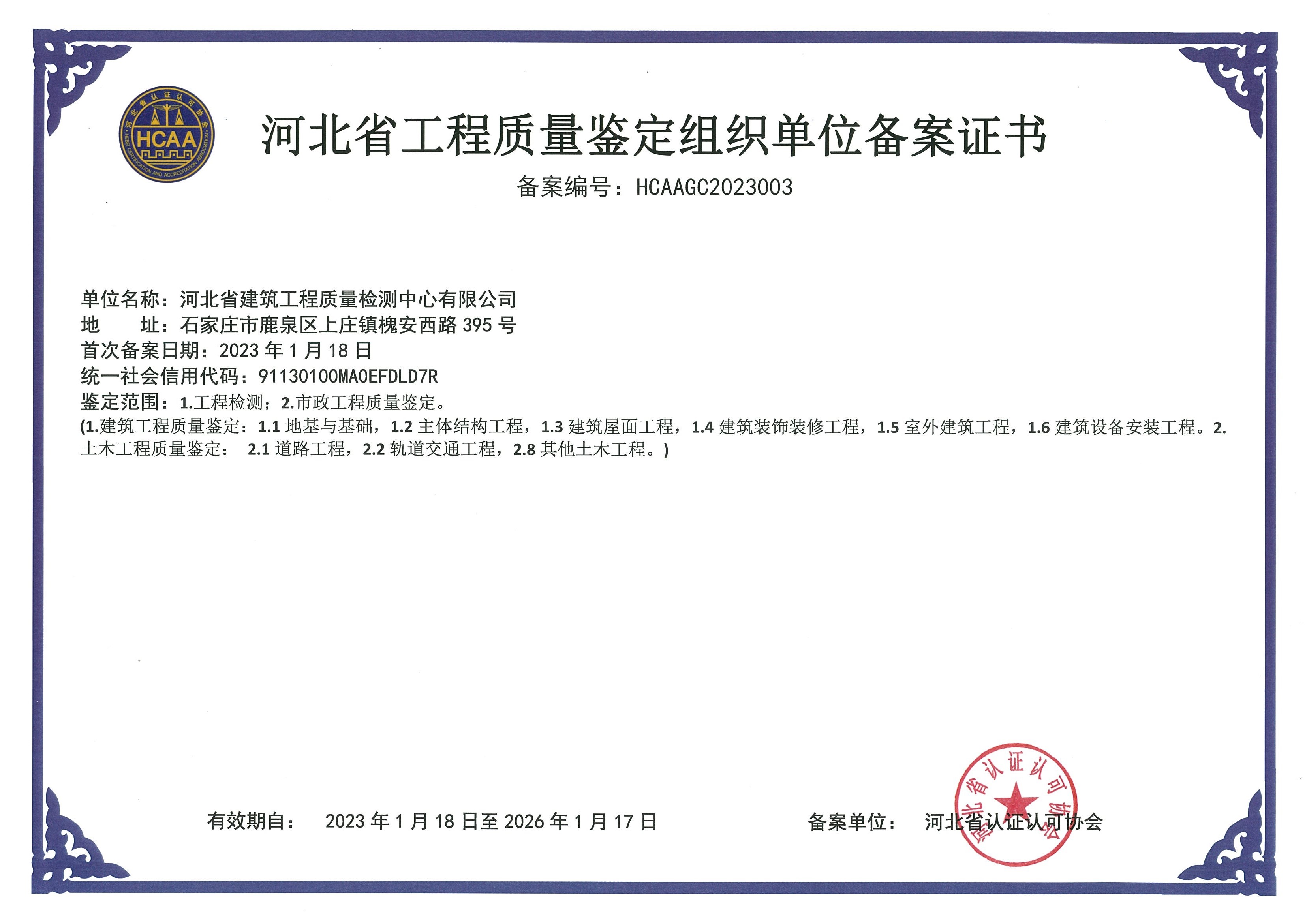 河北省建筑工程質(zhì)量檢測中心產(chǎn)品質(zhì)量鑒定組織單位備案證書1