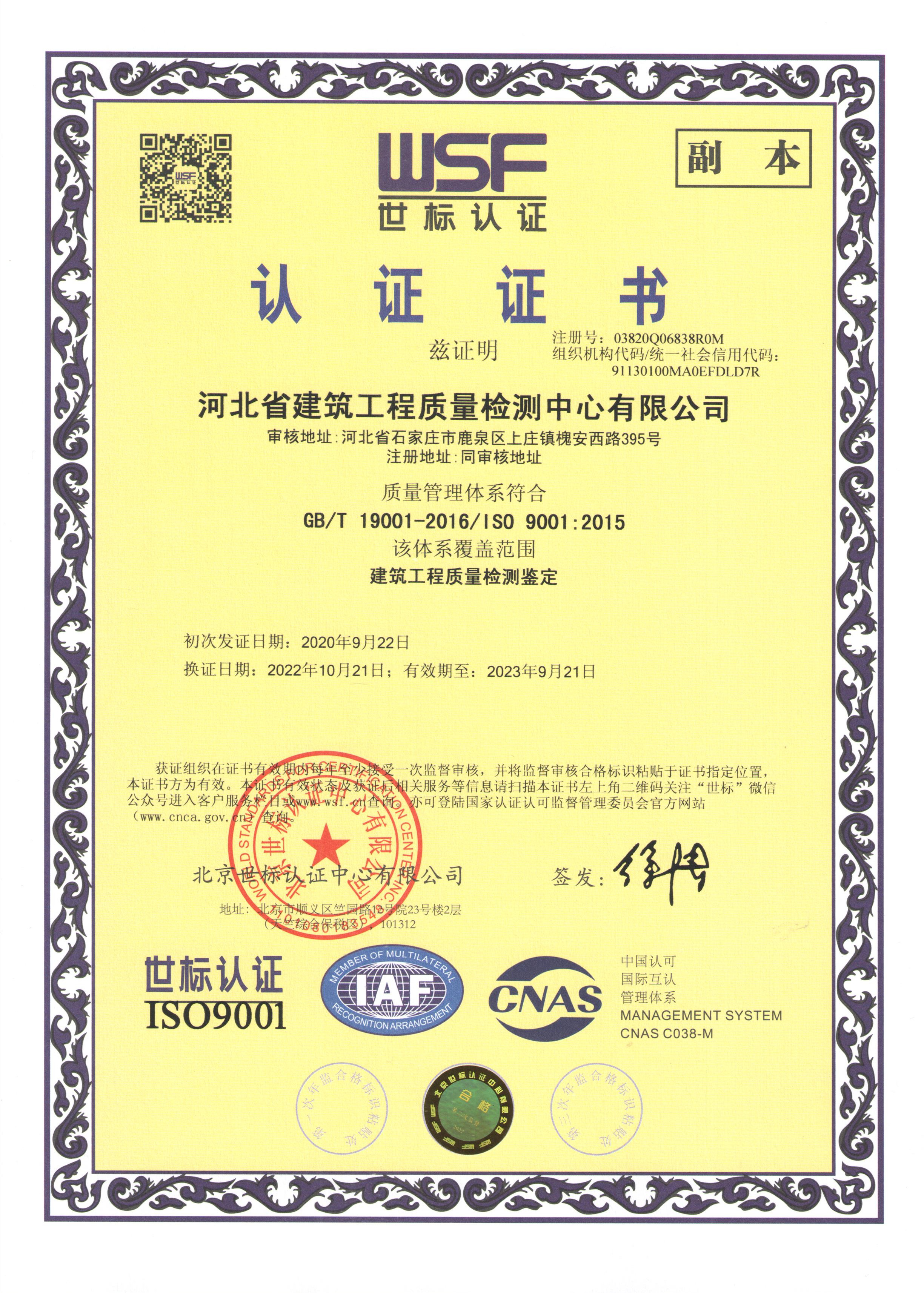 河北省建筑工程質(zhì)量檢測中心認(rèn)證證書2